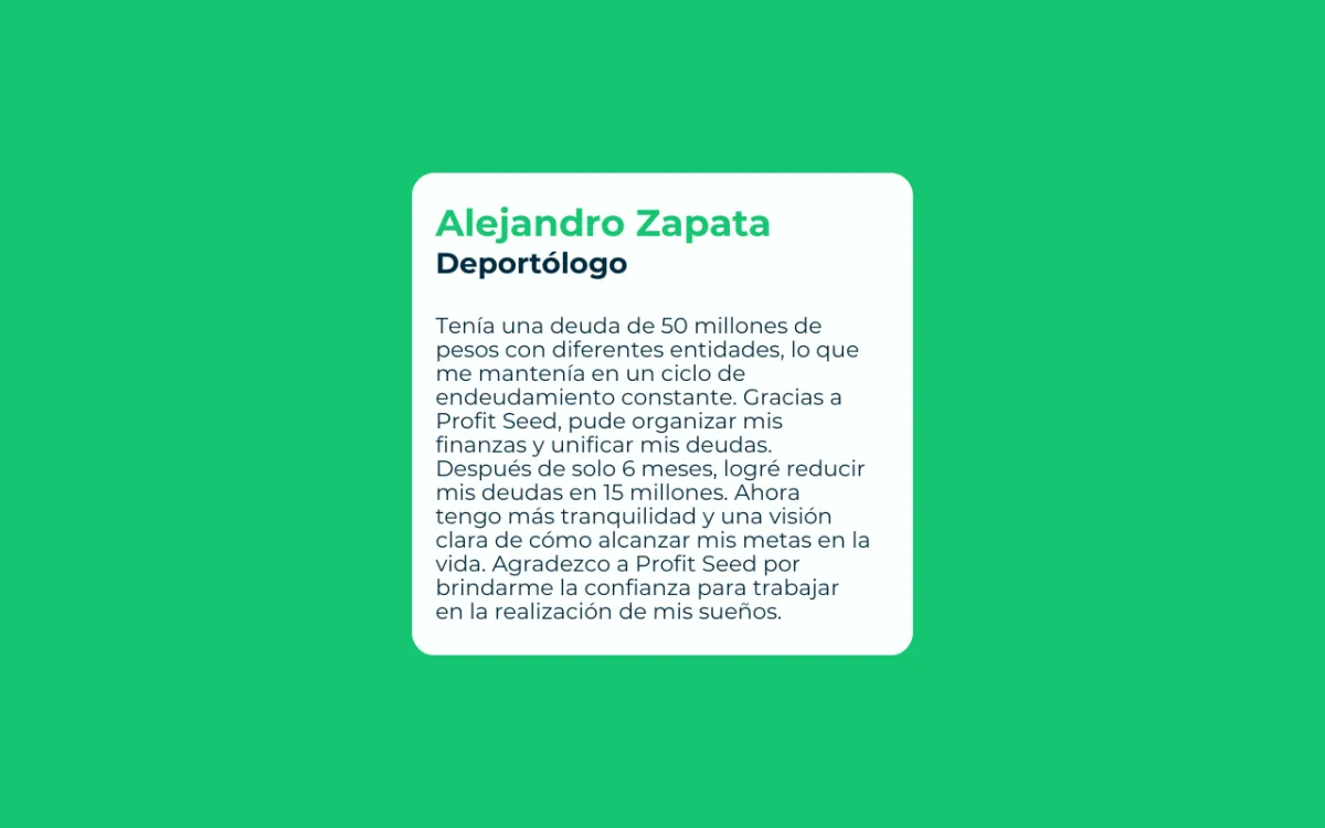 Mi misión es guiarte en la transformación de tus finanzas personales. Después de superar la quiebra y una deuda abrumadora en mi juventud, decidí educarme financieramente y establecí Profit Seed para acompañarte en la mejora de tus hábitos financieros. Estamos aquí para brindarte apoyo y proporcionarte las herramientas necesarias para alcanzar la estabilidad financiera y el bienestar que deseas.